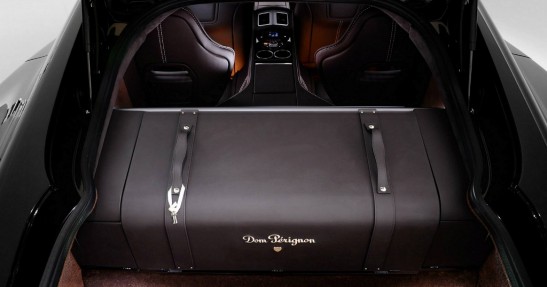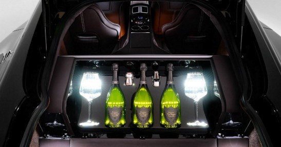 W bagażniku auta znajdziemy zabudowaną skrzynię wykonaną z drewna i wykończoną skórą oraz alkantarą. Skrzynia skrywa butelki Dom Perignon, kryształowe szkło oraz otwieracze.