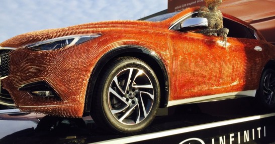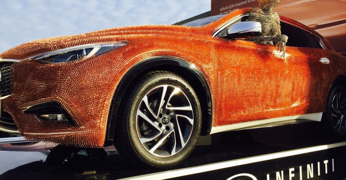 Na nietypowy pomysł ozdobienia Infiniti wpadła artystka Rachel Ducker. Miedziane pinezki sprawiają podobno, że światło zupełnie inaczej rozkłada się na karoserii i jeszcze lepiej podkreśla interesujące linie nowego kompaktu z Japonii. Auto można będzie podziwiać do 26 stycznia w Londynie.