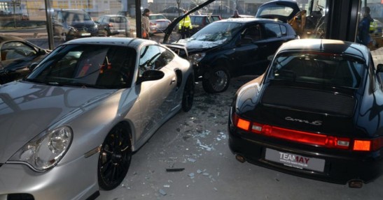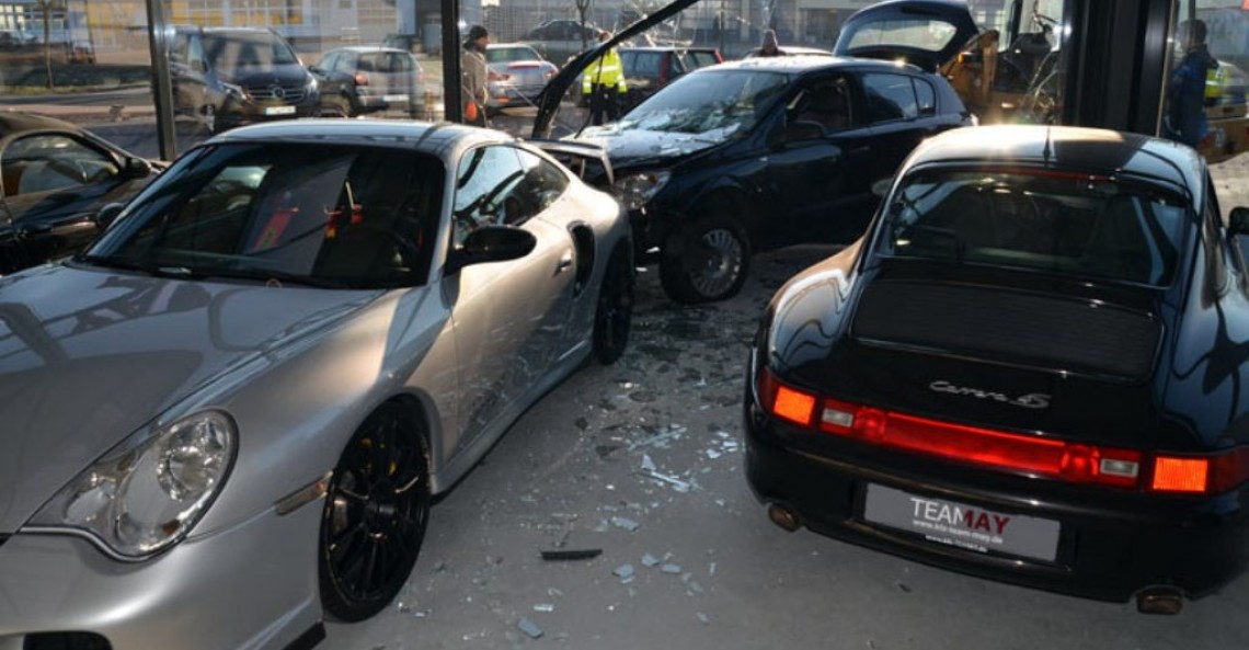 60-letni kierowca z niemieckiego miasta Stade stracił panowanie nad swoim autem i zakończył podróż w salonie Porsche.